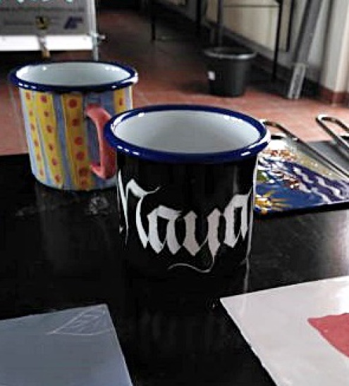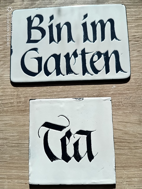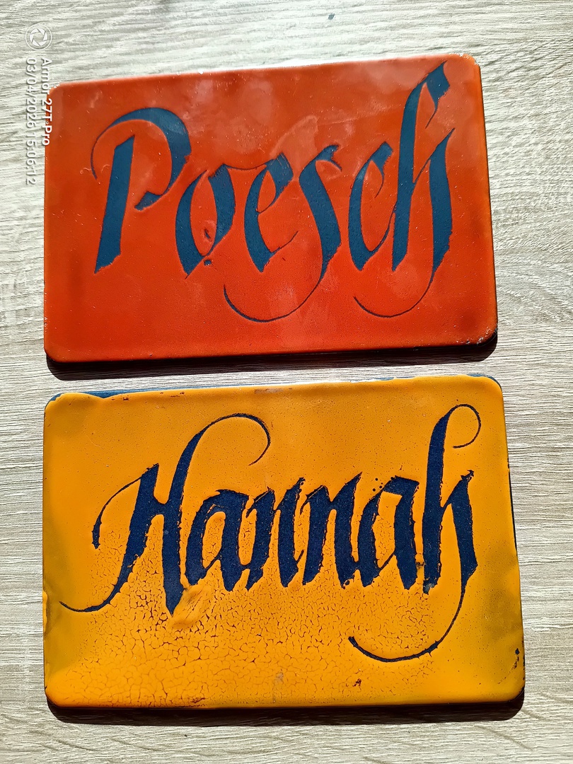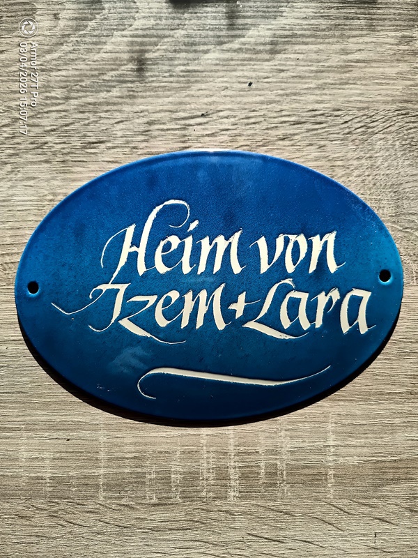 Über ein Projekt von kultur.lokal.machen bin ich mit Hilfe von Martin Schulze zum Emaillieren gekommen. Eine wirklich tolle Möglichkeit, Kalligrafie in zeitlose Objekte zu verwandeln. Individueller geht es kaum, wenn man zum Beispiel eine Hausnummer benötigt oder einen kurzen Spruch geschrieben haben will.