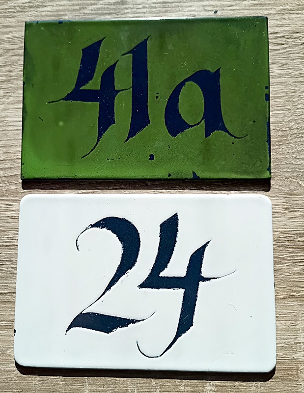 Die Metallschilder sind 10 cm x 15 cm, bei den Fliesen ist man deutlich flexibler.