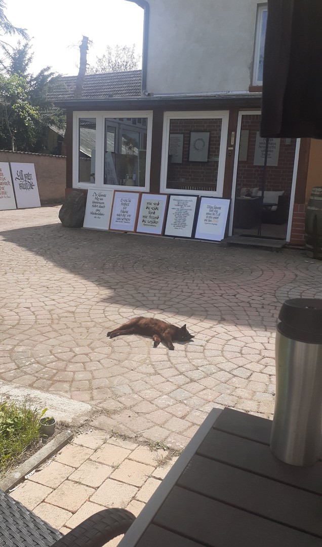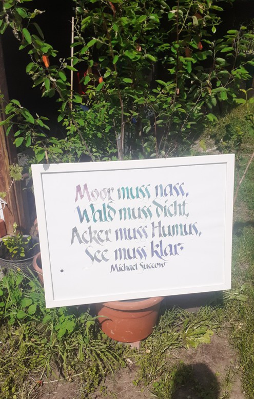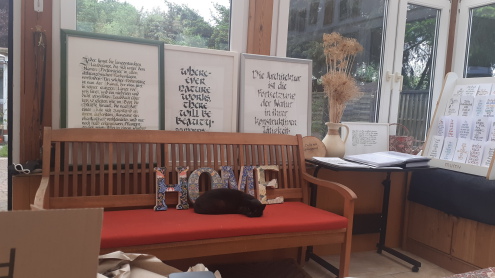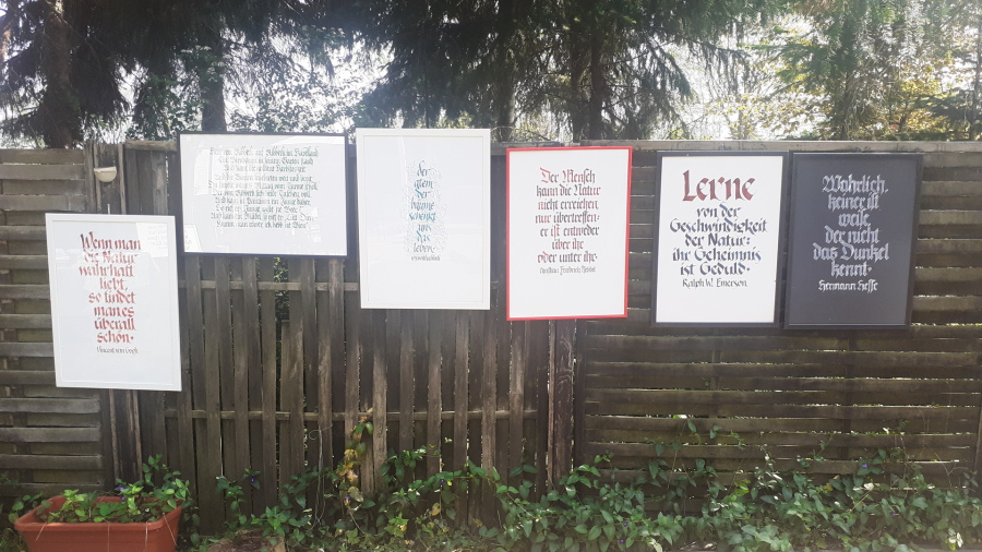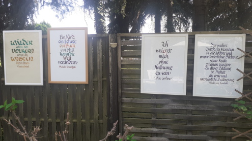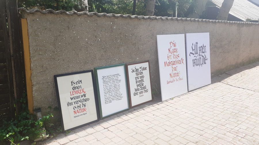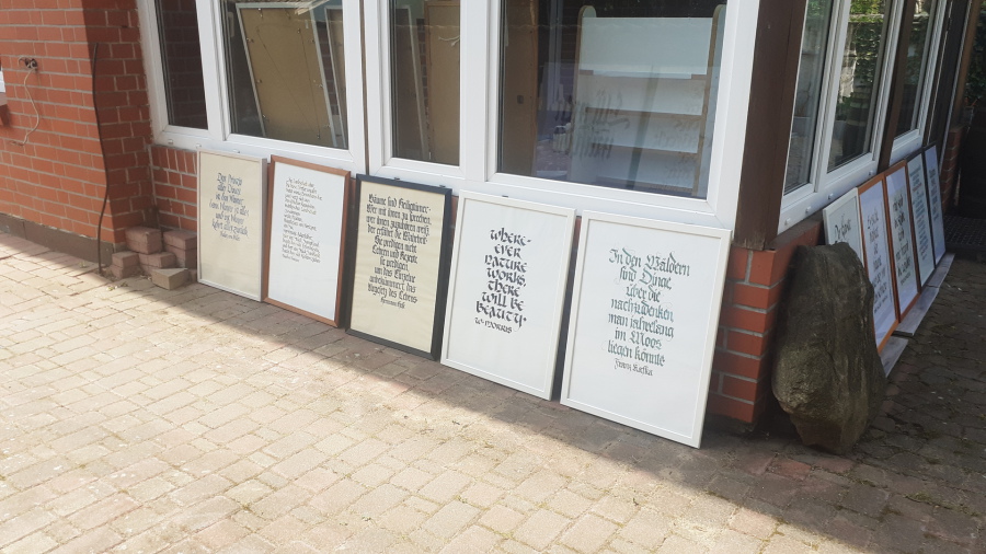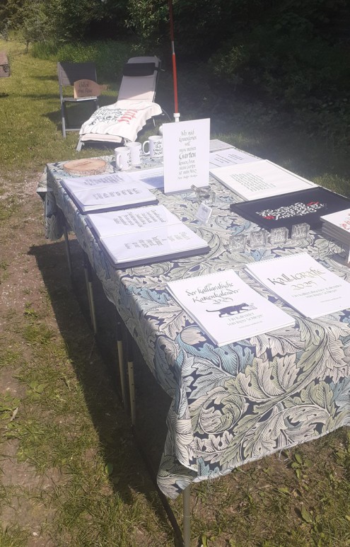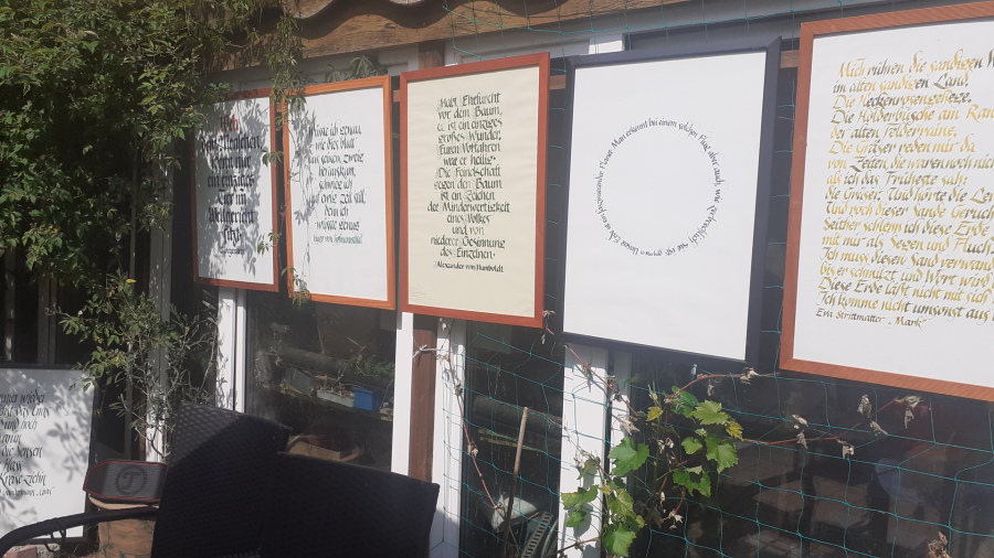Bei perfektem Sonnenschein konnte ich an diesem Wochenende im Mai wieder meine Werke auf dem Hof präsentieren. Zwischendurch ist immer Zeit für ein Schwätzchen und zum Kalligrafieren kommt man auch noch.